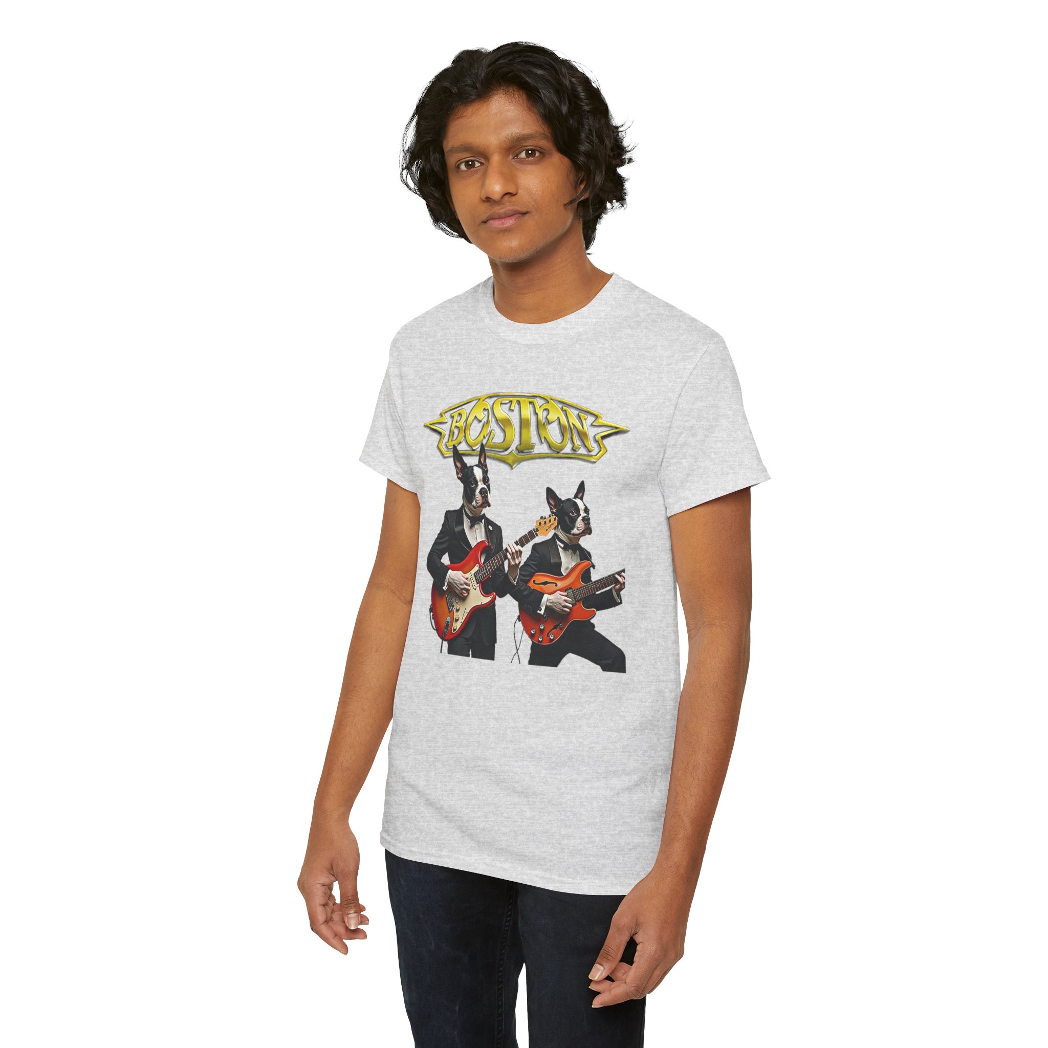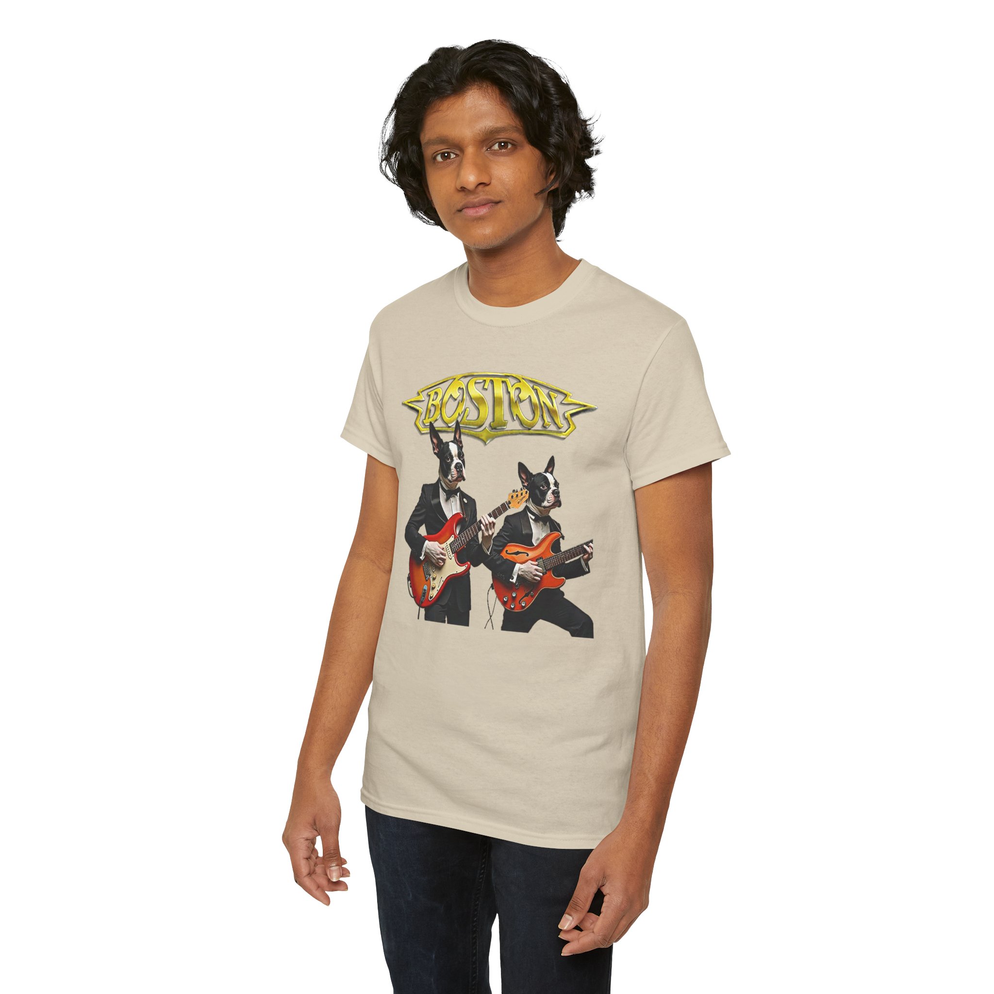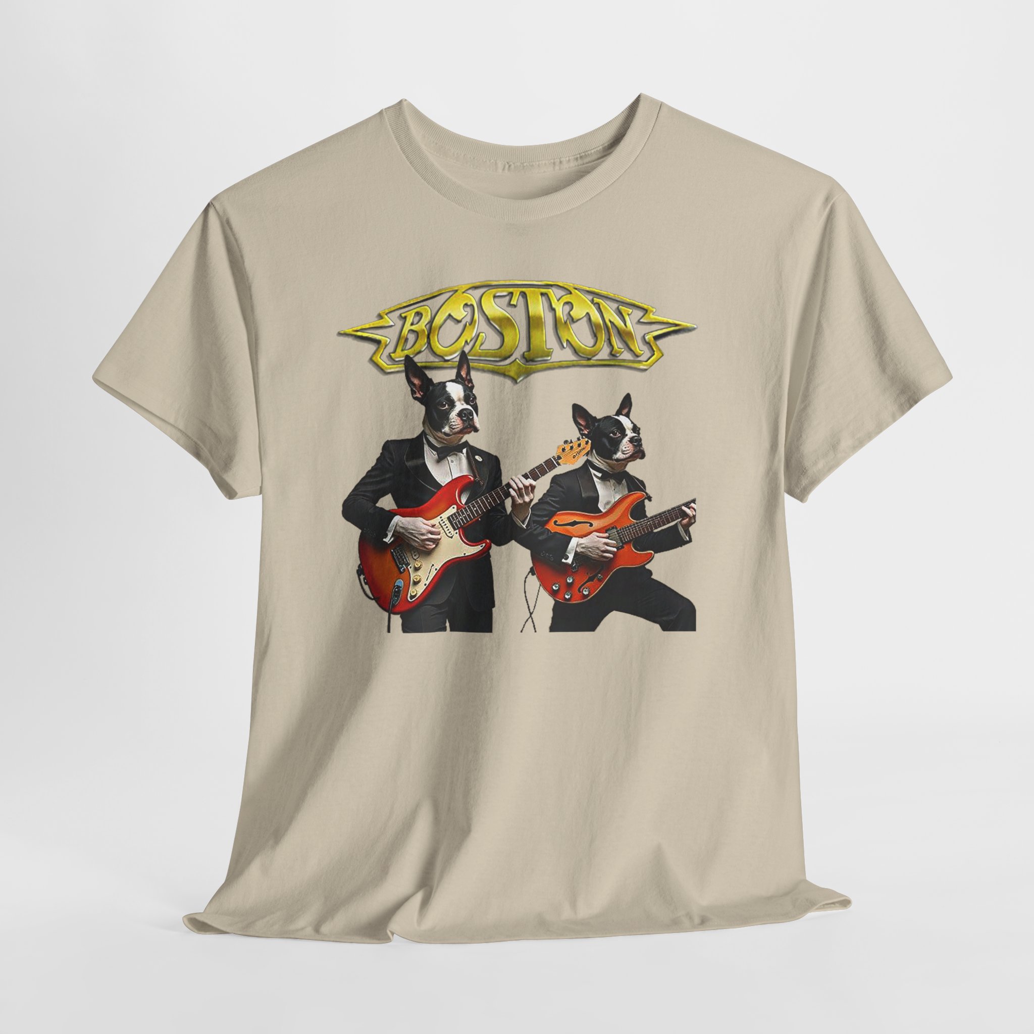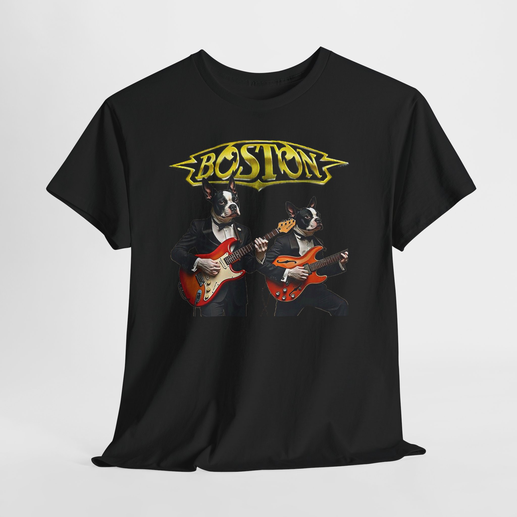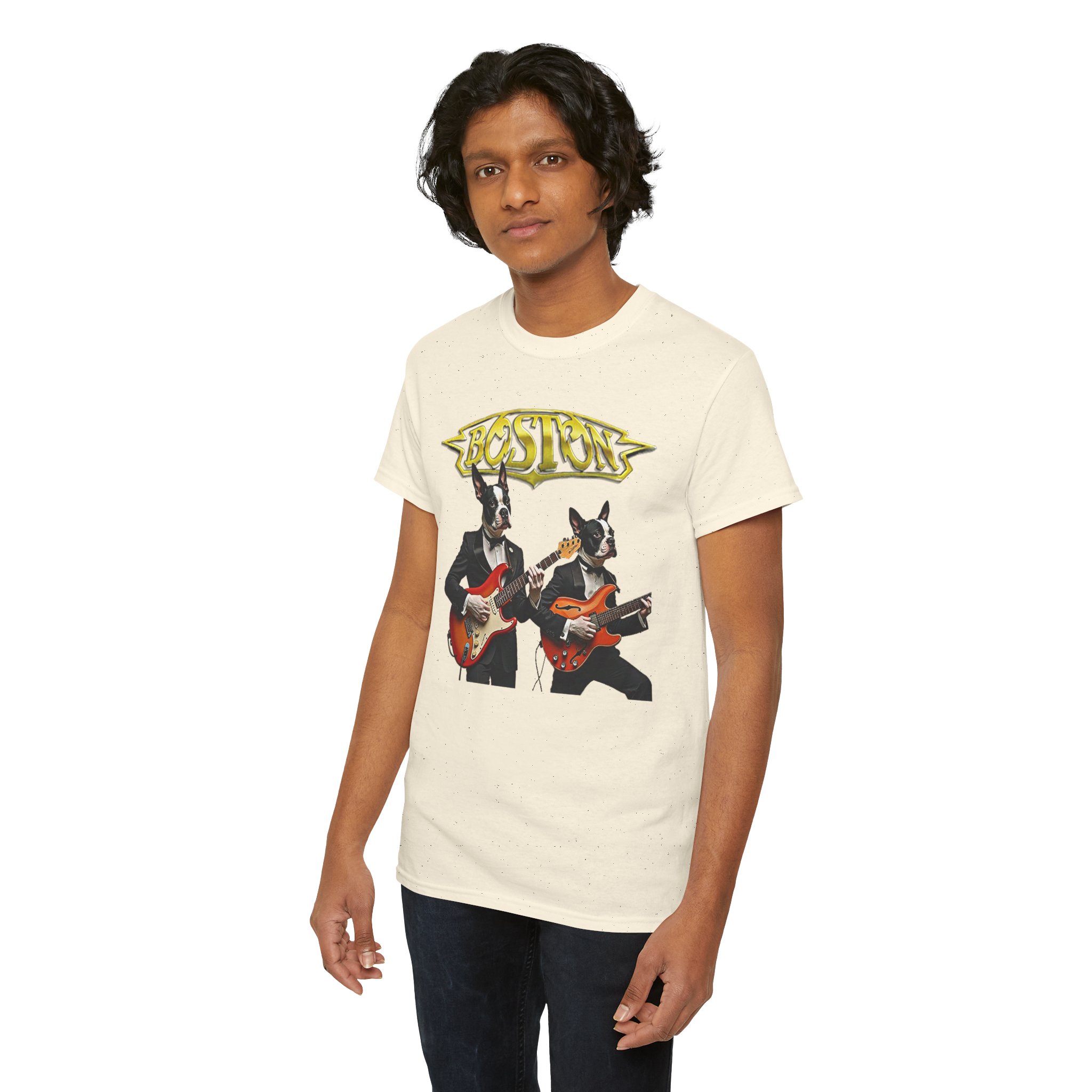 This relaxed, classic-fit tee brings playful vintage rock energy to everyday wear. Two tuxedo-clad Boston terriers stand mid-riff, guitars slung low, captured in crisp, detailed print work that keeps the image bright wash after wash. The medium-weight cotton drapes comfortably — sturdy enough for repeated wear, soft enough for long rehearsals, late-night drives, or lazy weekends. Wear it with faded jeans and a beat-up amp for an effortlessly nostalgic look that speaks to dog-loving music fans and anyone who remembers vinyl sleeves and late-night radio shows.