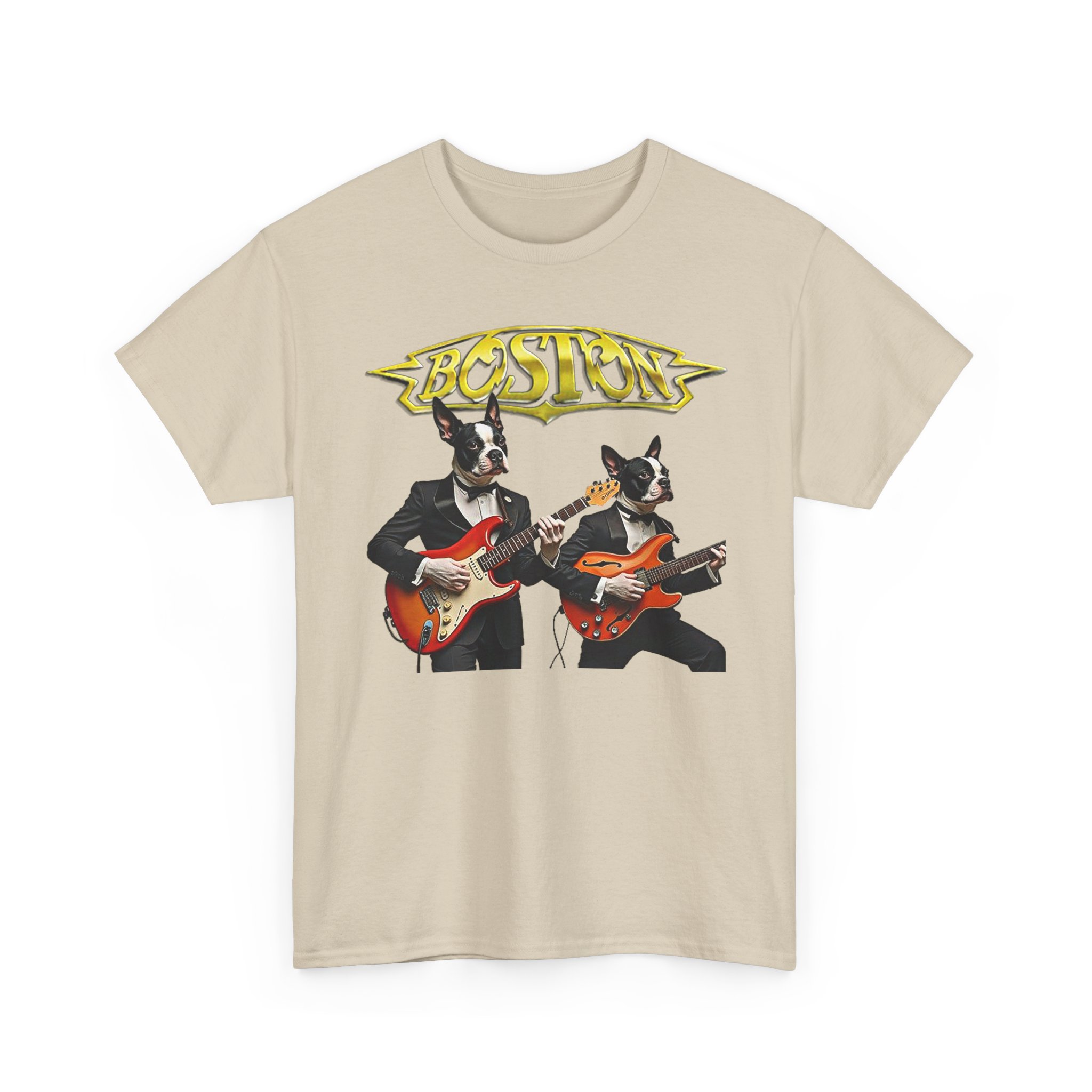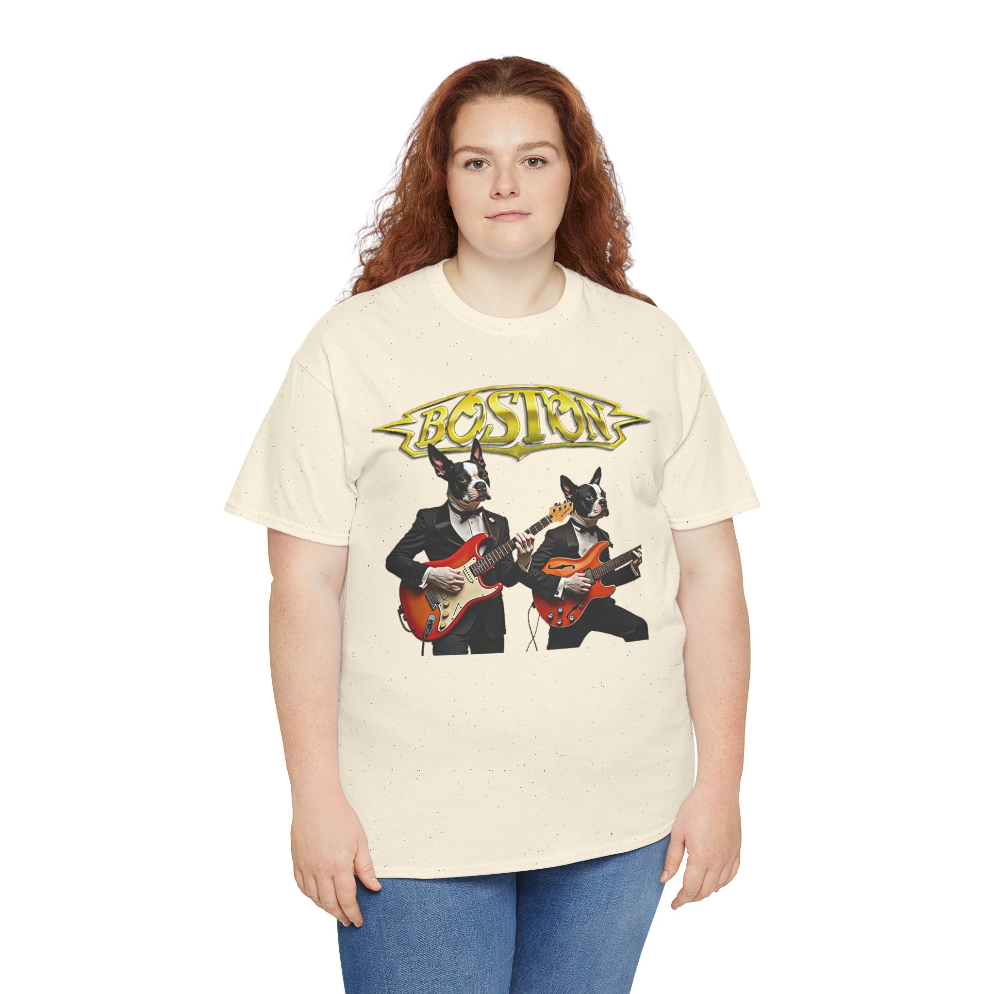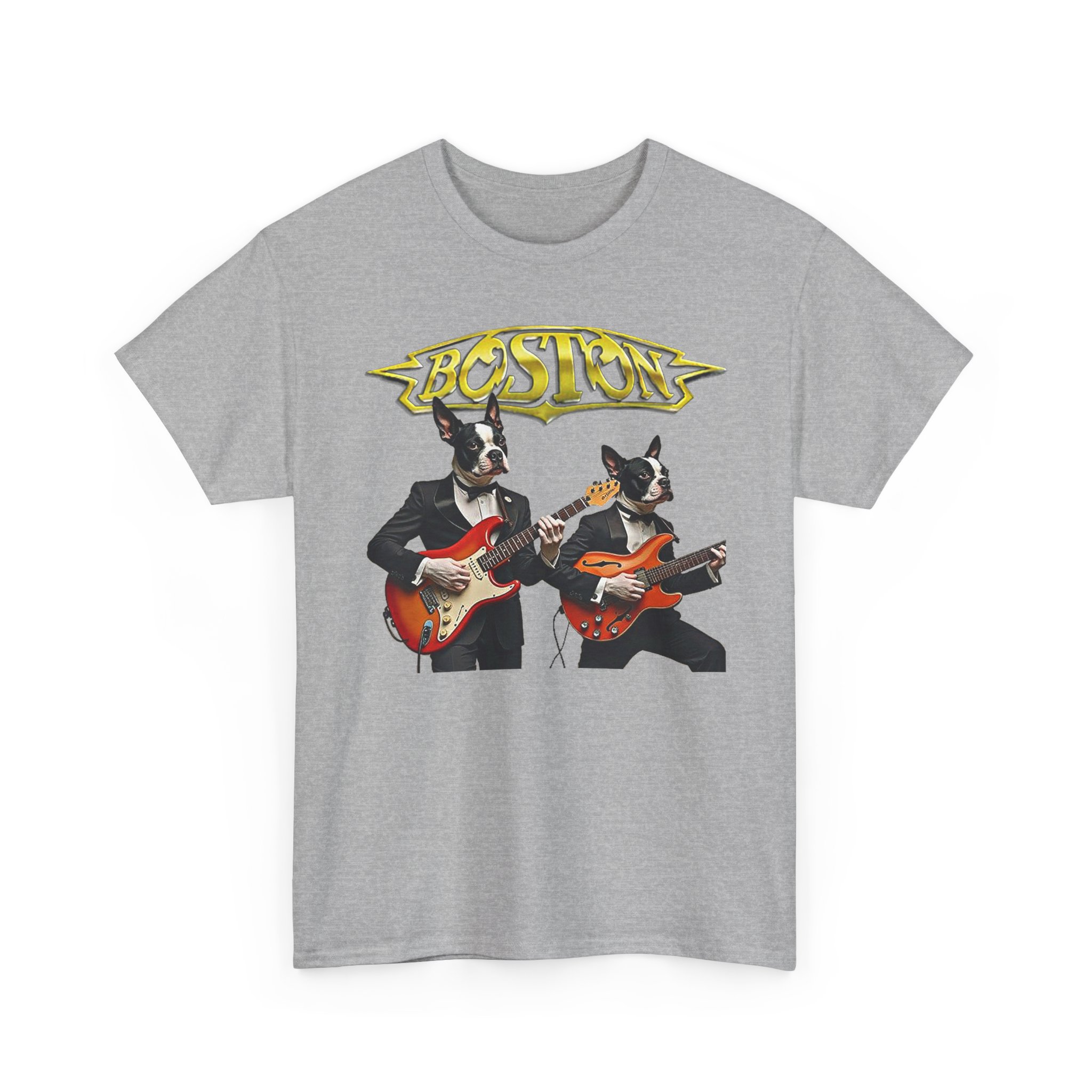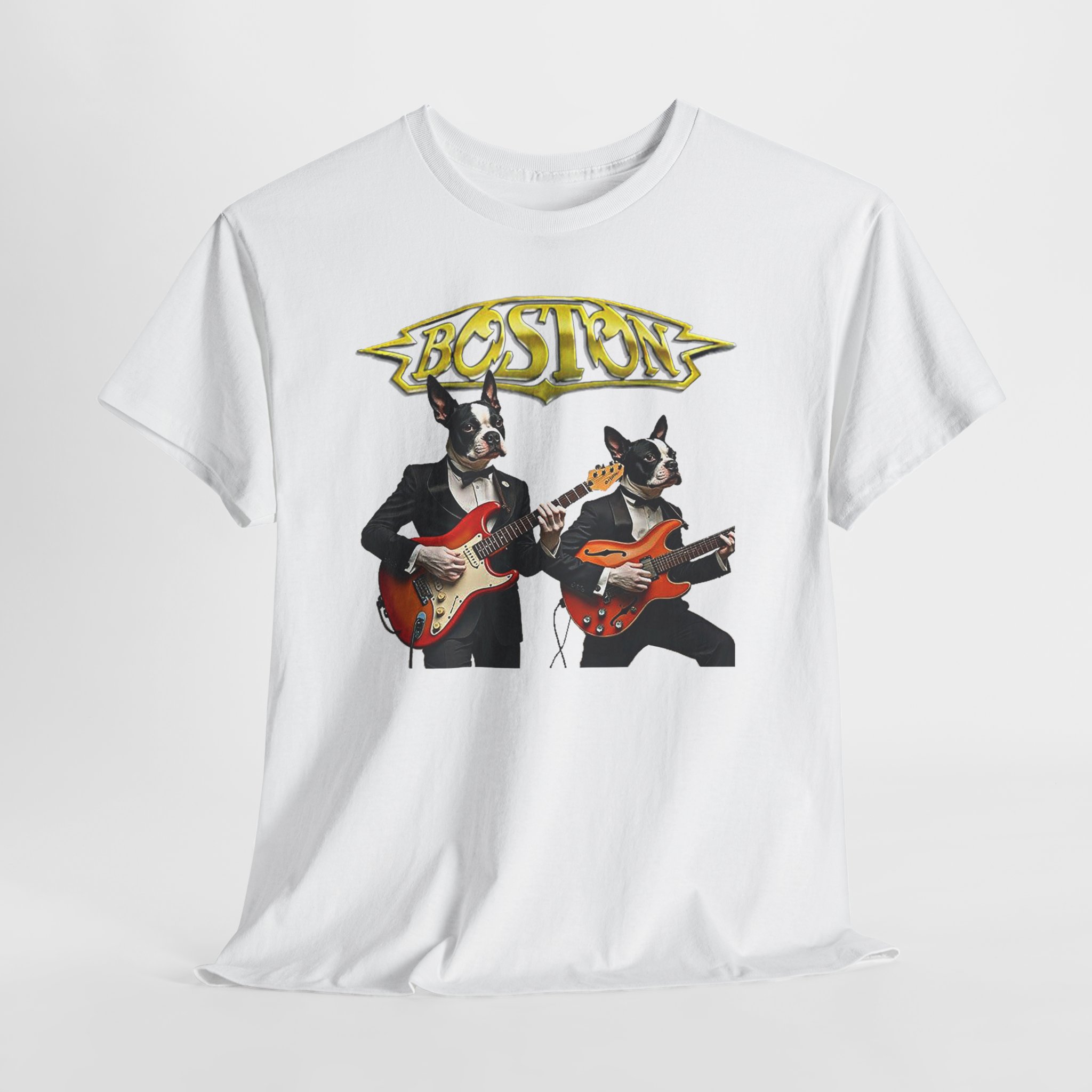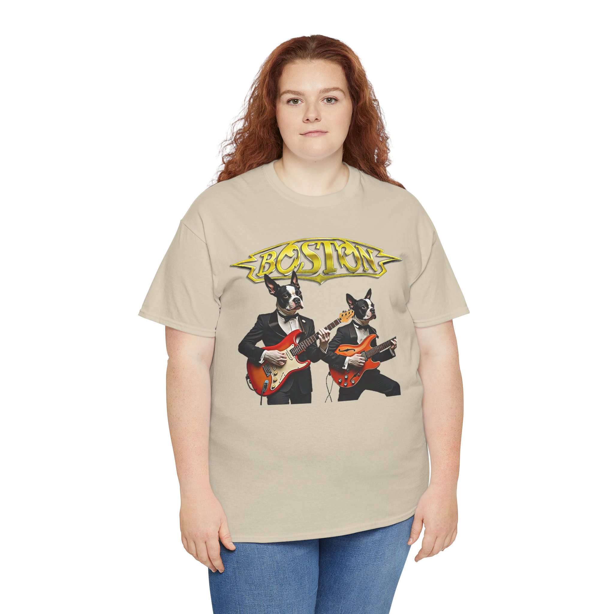 This relaxed, classic-fit tee brings playful vintage rock energy to everyday wear. Two tuxedo-clad Boston terriers stand mid-riff, guitars slung low, captured in crisp, detailed print work that keeps the image bright wash after wash. The medium-weight cotton drapes comfortably — sturdy enough for repeated wear, soft enough for long rehearsals, late-night drives, or lazy weekends. Wear it with faded jeans and a beat-up amp for an effortlessly nostalgic look that speaks to dog-loving music fans and anyone who remembers vinyl sleeves and late-night radio shows.