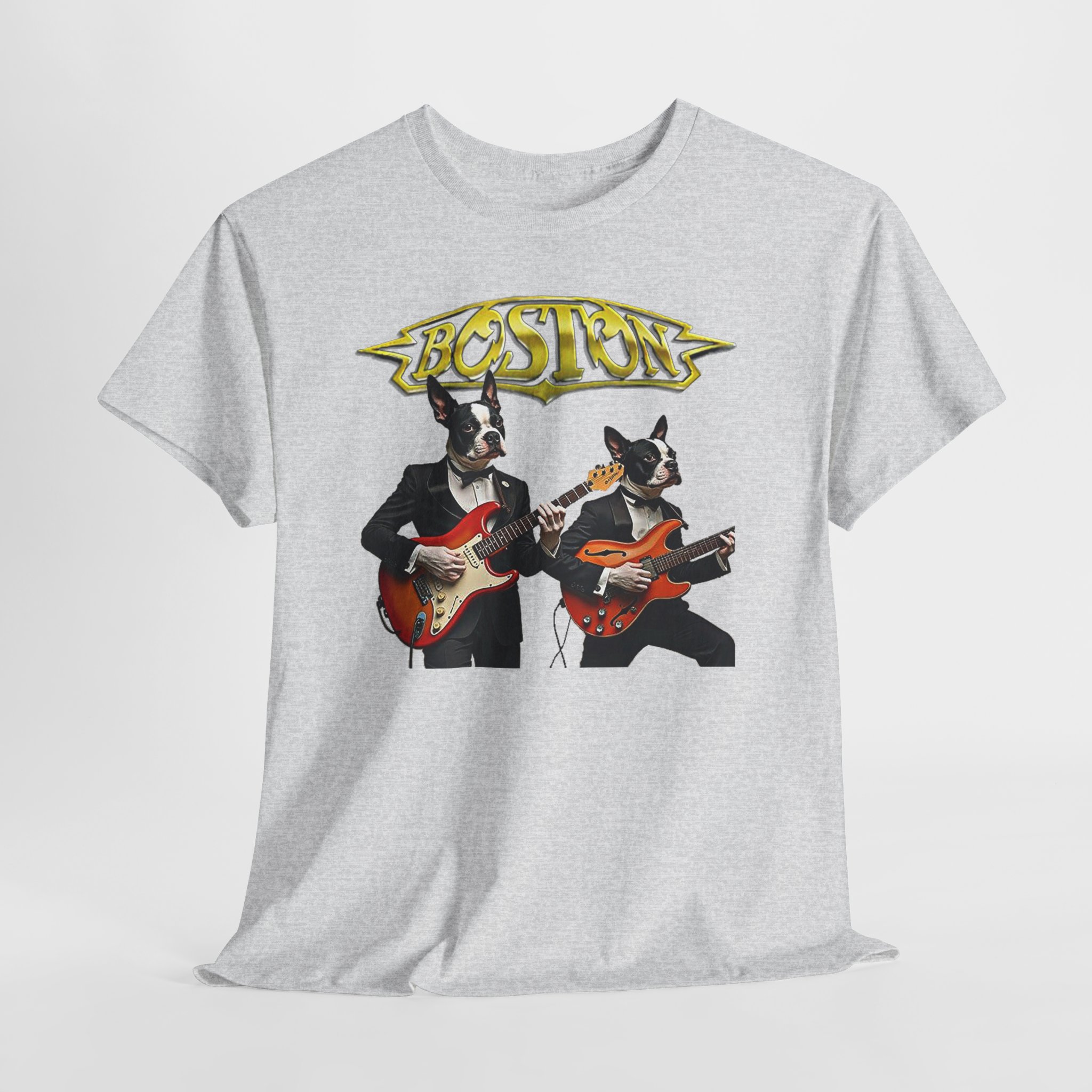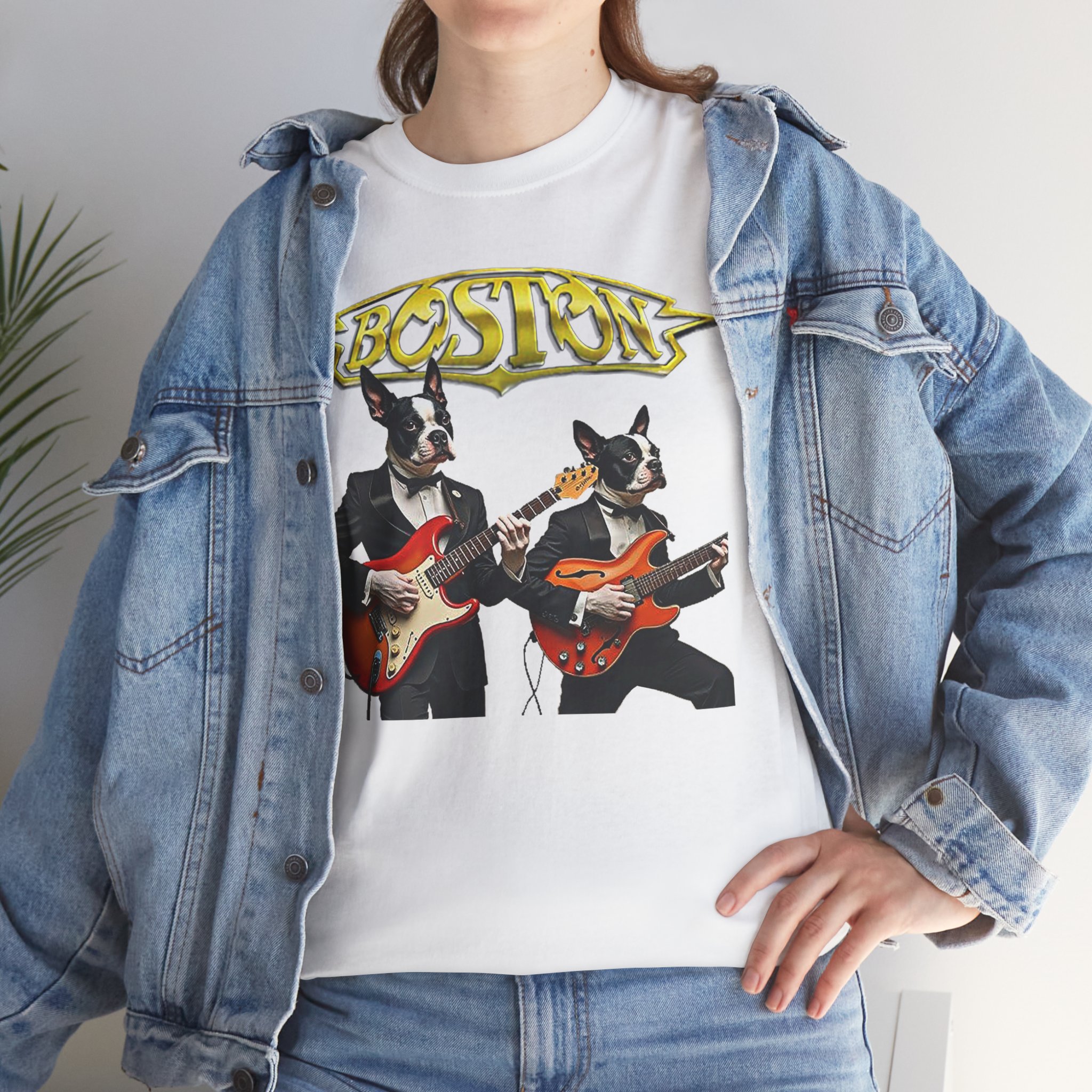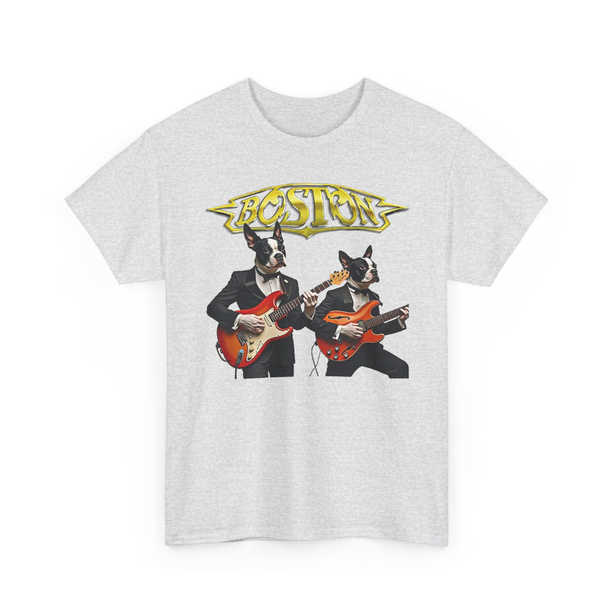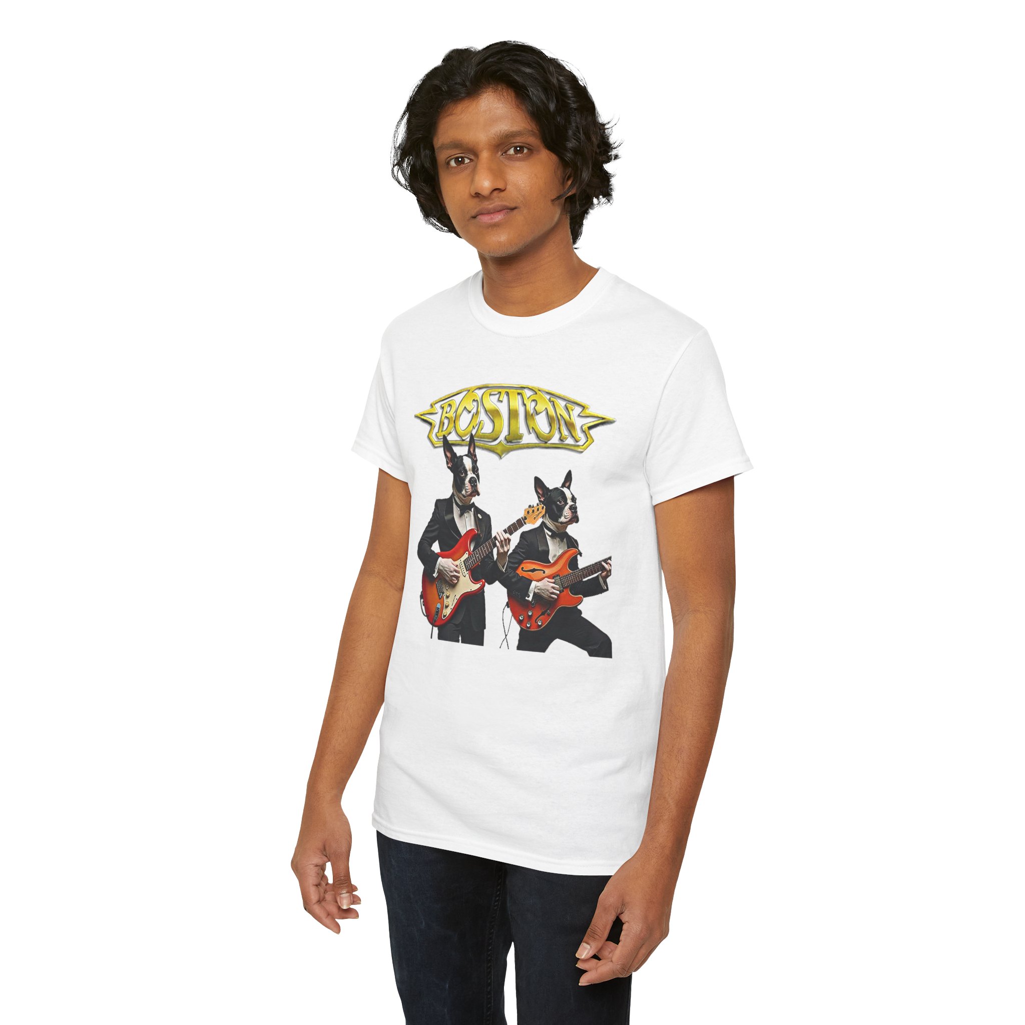 This relaxed, classic-fit tee brings playful vintage rock energy to everyday wear. Two tuxedo-clad Boston terriers stand mid-riff, guitars slung low, captured in crisp, detailed print work that keeps the image bright wash after wash. The medium-weight cotton drapes comfortably — sturdy enough for repeated wear, soft enough for long rehearsals, late-night drives, or lazy weekends. Wear it with faded jeans and a beat-up amp for an effortlessly nostalgic look that speaks to dog-loving music fans and anyone who remembers vinyl sleeves and late-night radio shows.